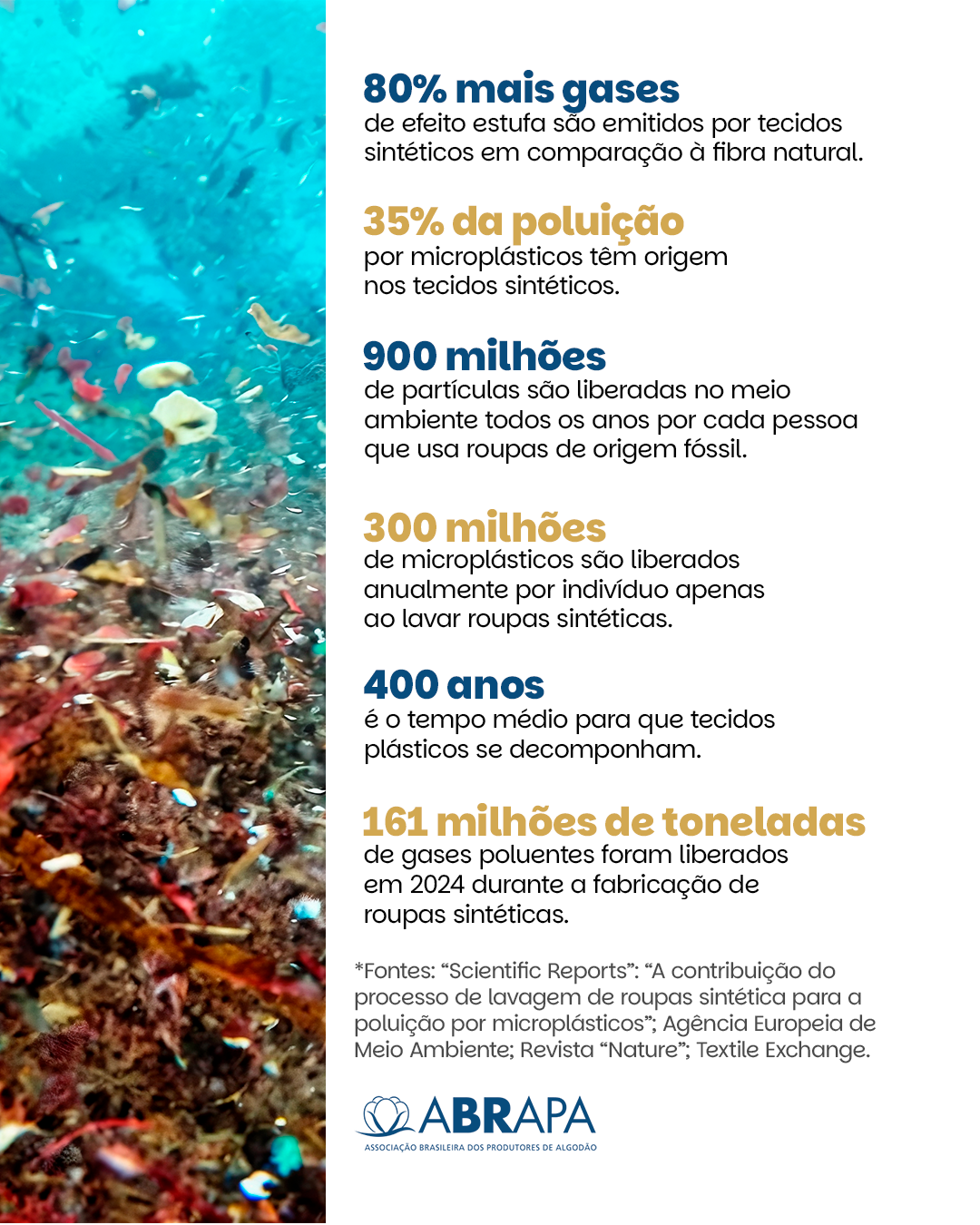 De acordo com dados da Textile Exchange, em 2024 a fabricação de roupas compostas por fibras sintéticas correspondeu a 161 milhões de toneladas de gases de efeito estufa liberados na atmosfera, contra 34 milhões de toneladas produzidas pela confecção de peças de fibras naturais, gerando 80% menos emissões do que confecção das peças baseadas em petróleo.