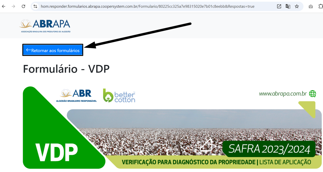 Passo 4: Ao acessar o formulário, o usuário terá alguns botões disponíveis: a. Retornar aos formulários: Ao clicar, retorna para o aplicativo com os formulários em lista;
