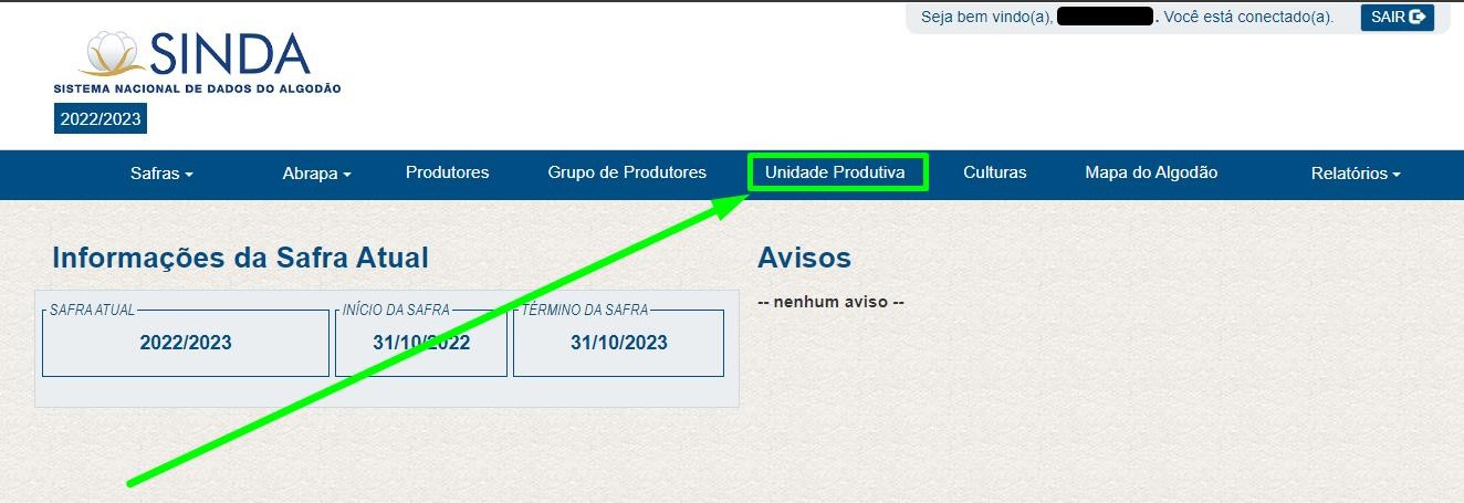 Na página inicial do sistema SINDA, você deve clicar no menu: Unidade Produtiva, para ter acesso às informações da Fazenda/UP.
