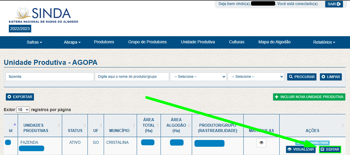 Encontrando a Fazenda/UP desejada. Agora, você deve clicar em “Editar”, para visualizar as informações da Fazenda/UP e caso queira, realizar alguma alteração.