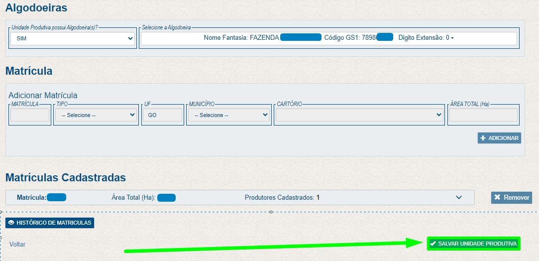 Atualizando o cadastro da Fazenda/UP no sistema SINDA, que possui Algodoeira/UBA.