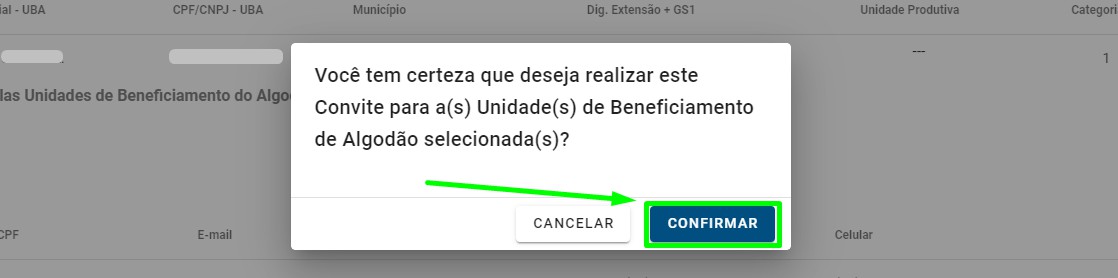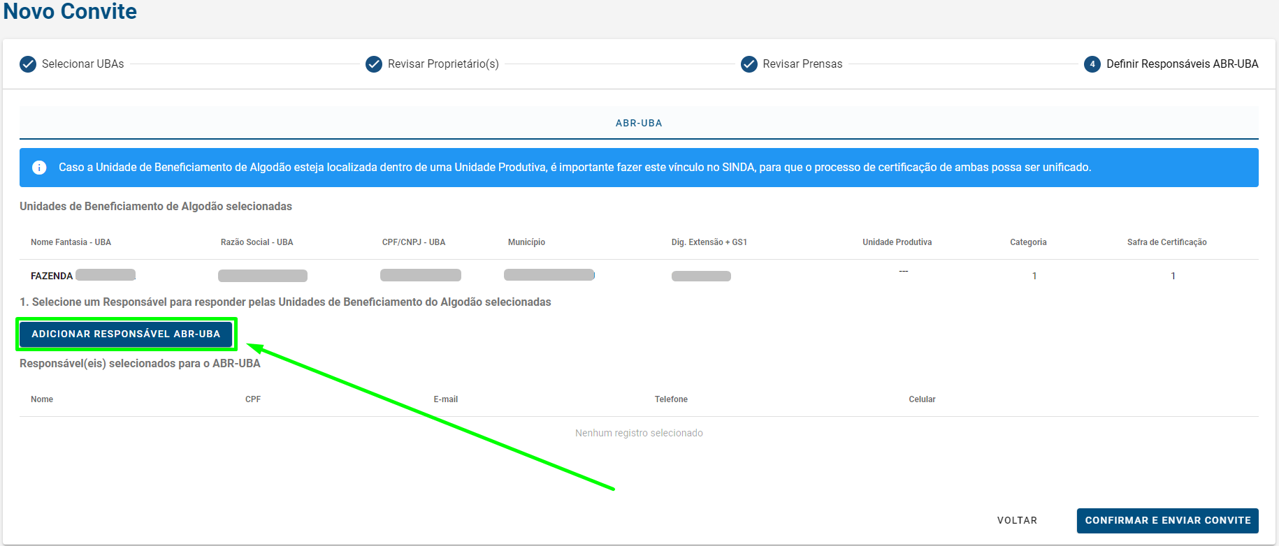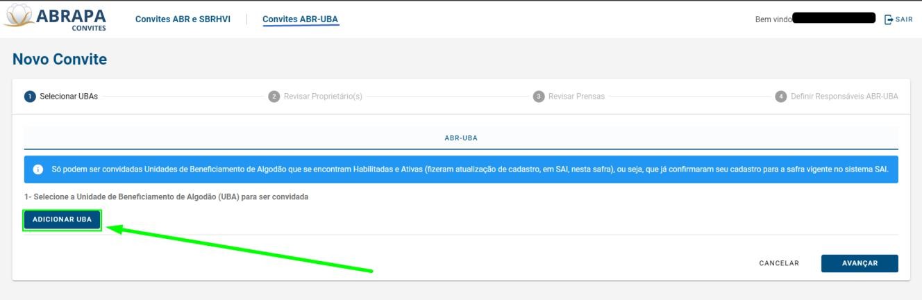 Depois de clicar em Realizar convite ABR-UBA, o sistema apresentará o botão “Adicionar UBA”, onde será adicionada(s) a(s) Algodoeira(s)/UBA(s) que irá ser convidada.