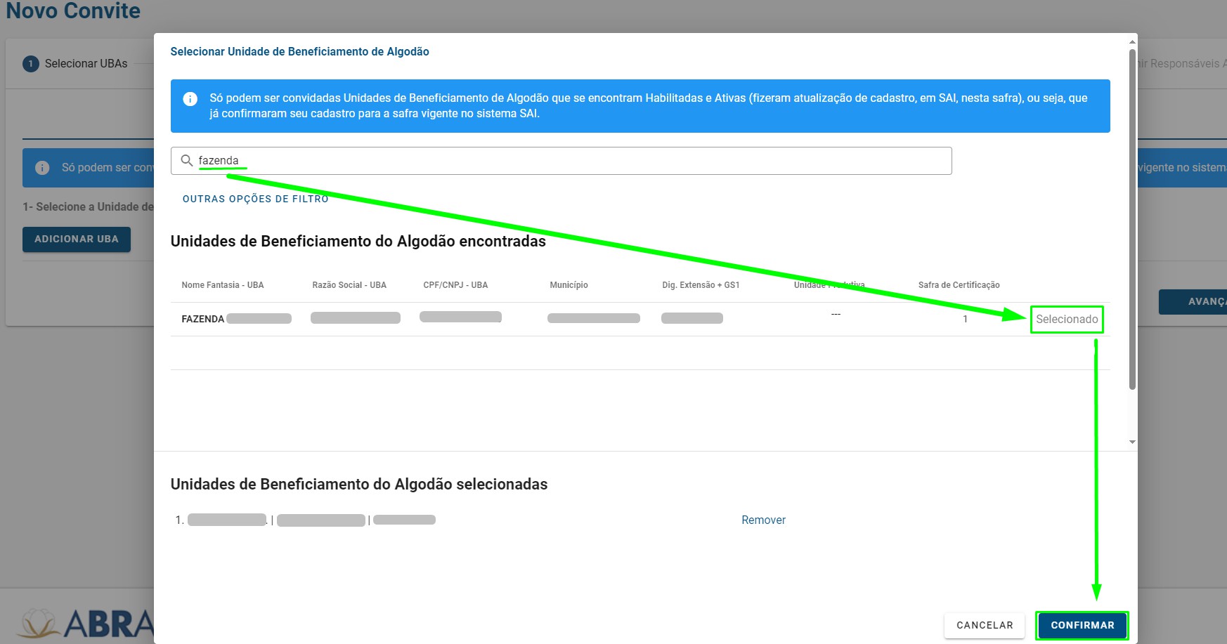Após selecionar o botão “Adicionar UBA”, o sistema apresenta o campo, onde você pode pesquisar e selecionar a(s) Algodoeira(s)/UBA(s), desejada. Selecionando, agora é somente confirmar!
