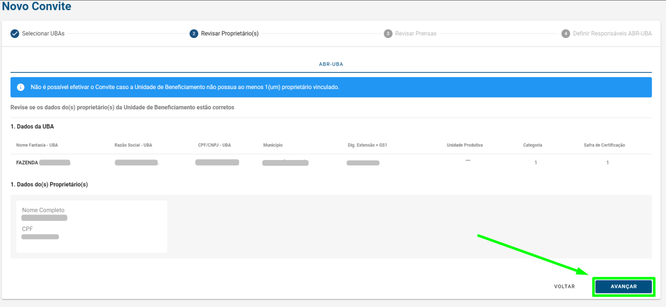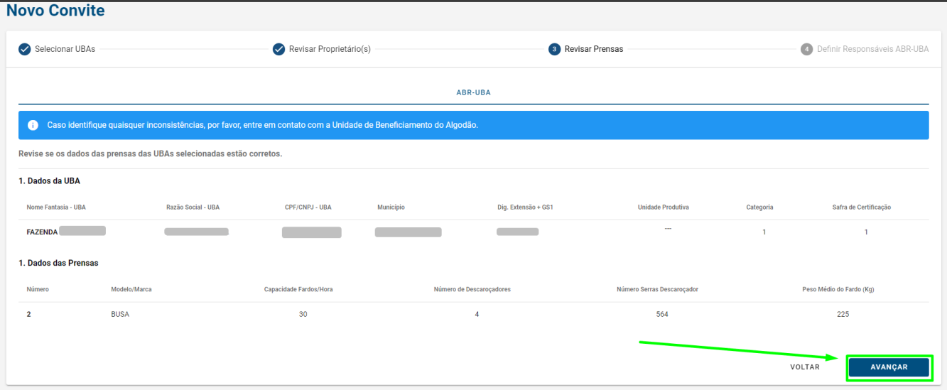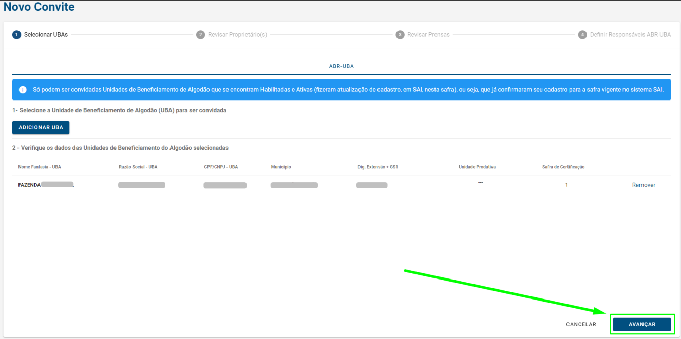 Depois de ter confirmado, a(s) Algodoeira(s)/UBA(s) selecionada, será apresentada na listagem. Você deve continuar clicando em avançar, sempre conferindo as informações. Imagem 1 Imagem 2 9 Imagem 3