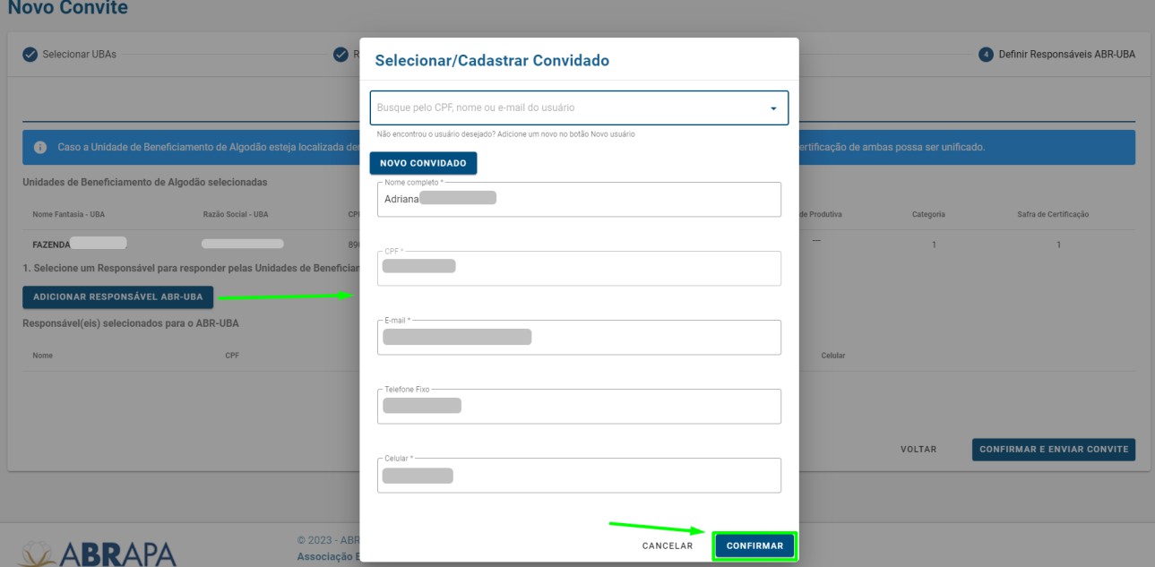 Agora você deve clicar no botão “Adicionar Responsável ABR-UBA”. Após a ação, o sistema apresentará um campo onde pode ser pesquisado um responsável existente e um botão com a opção de incluir um “Novo Convidado”, depois é somente “Confirmar” para seguir para a próxima etapa. Imagem 1   Imagem 2  Imagem 3