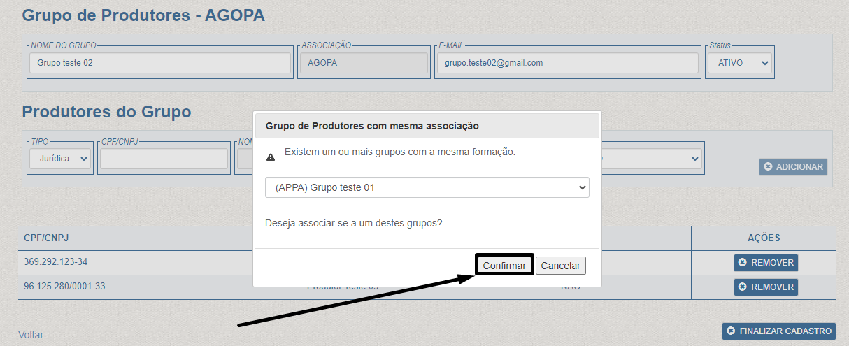 Passo 15 – Para finalizar o cadastro do grupo de produtores, clique em “Finalizar Cadastro”.